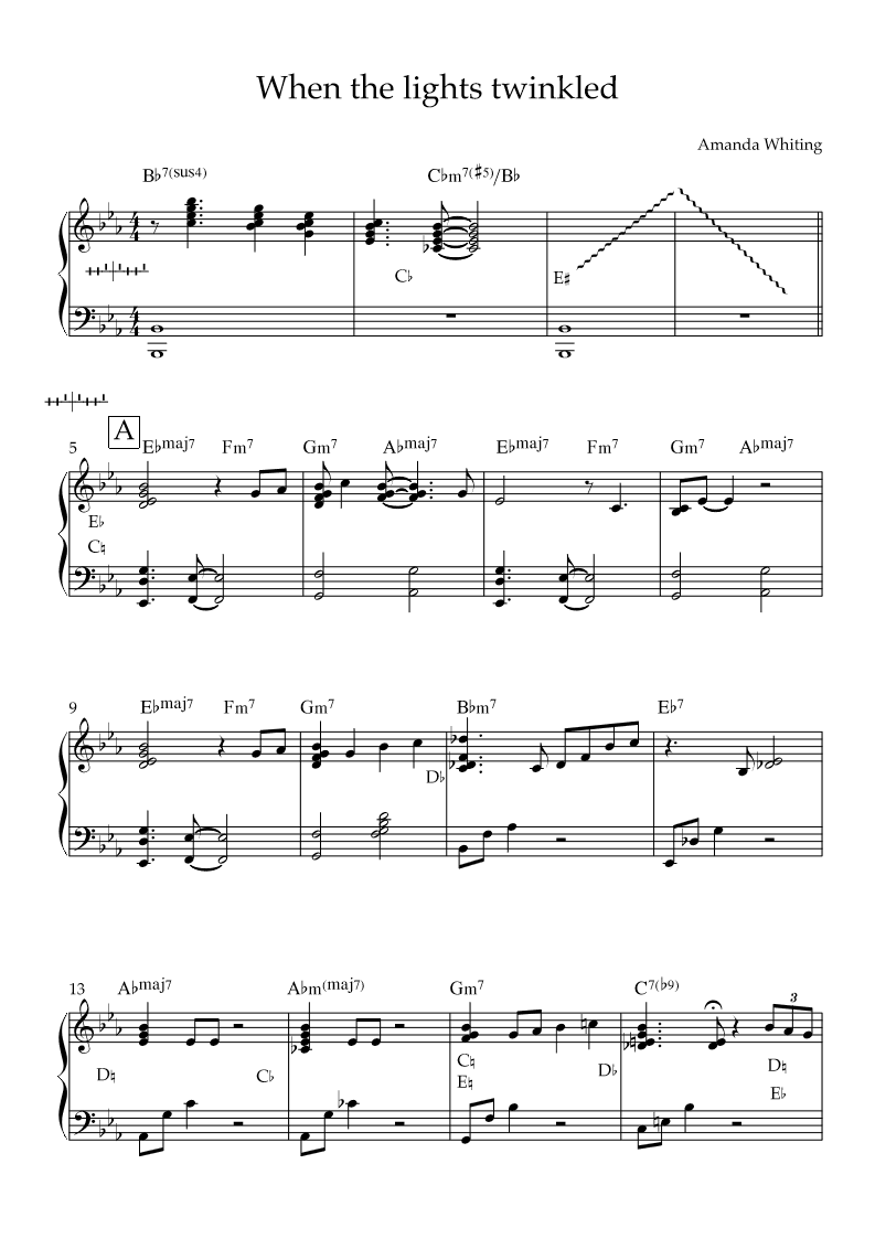 When the Lights Twinkled for solo pedal harp. Written for the Christmas season, this jazzy original piece is filled with rich harmonies, a warm sound, and includes an optional improvised section. This piece will surely get you in the holiday spirit!